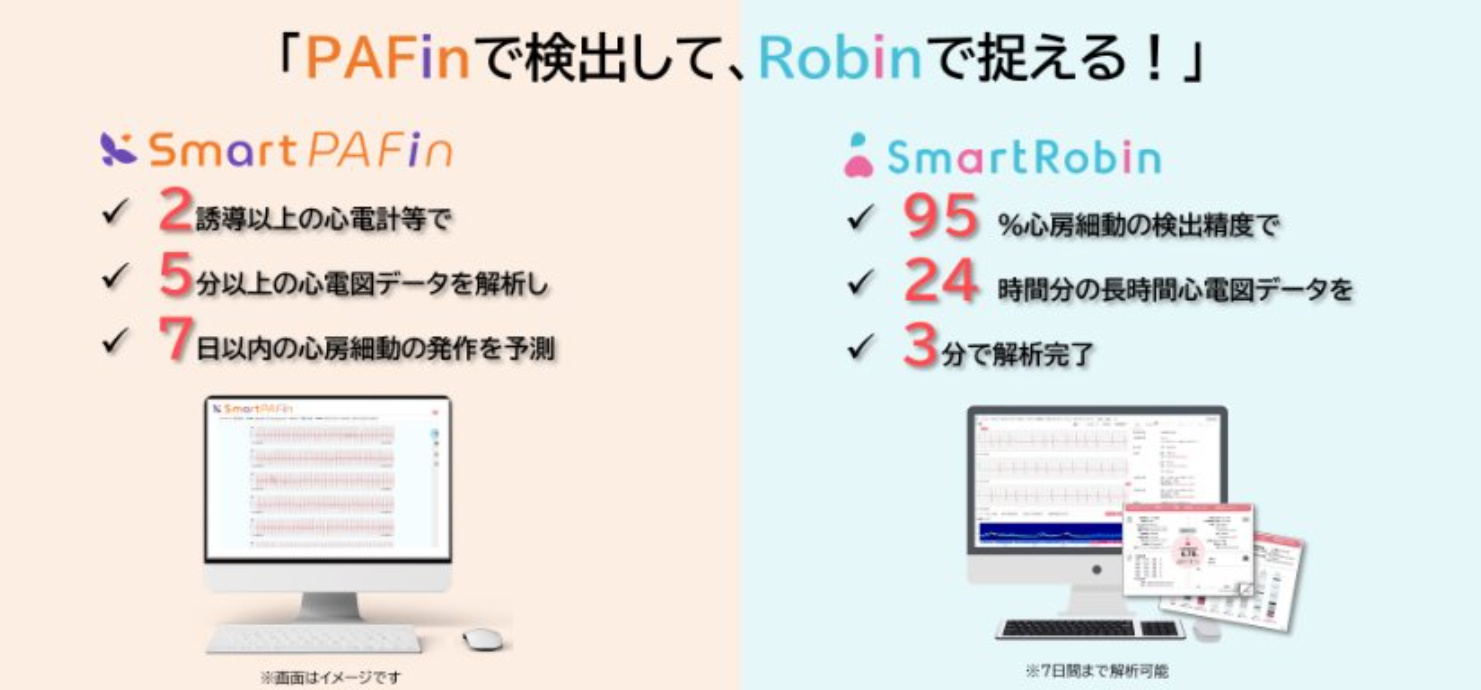 国際医療福祉大学発のヘルステックベンチャー。循環器専門医とAI研究者により2019年に設立され、心電図データ解析AI「SmartRobin AIシリーズ」や心房細動の発作リスク予測AI「SmartPAFinシリーズ」を開発。