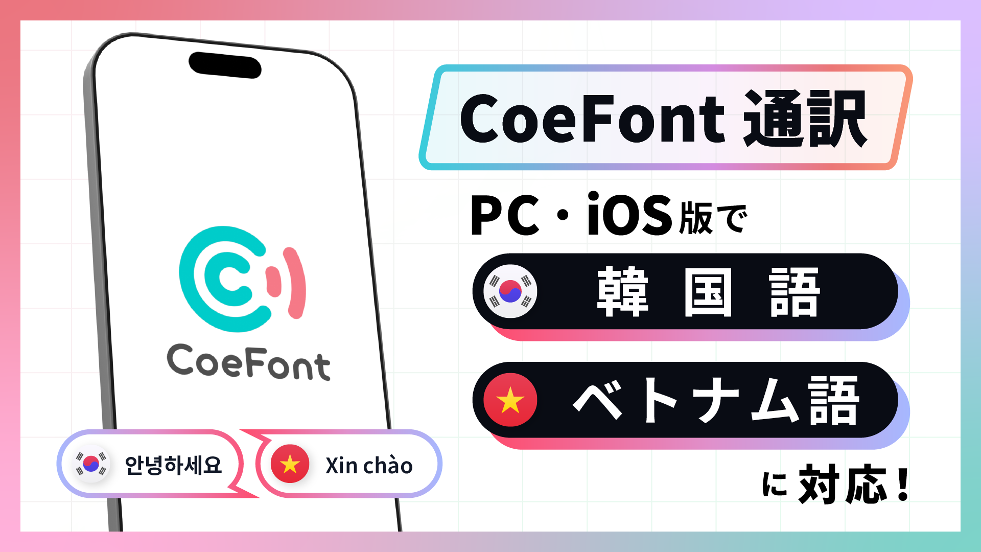 株式会社CoeFontは、AIライブ翻訳サービス「CoeFont通訳」のPC版とiOS版で、韓国語とベトナム語の通訳機能をリリースした。これにより同サービスの対応言語は英語、中国語、フランス語、スペイン語を含む全7言語となった。