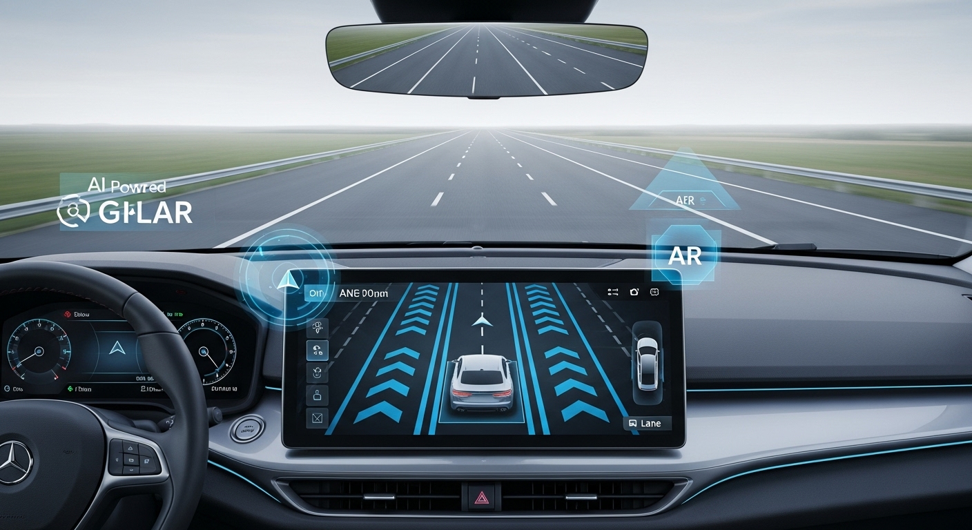 ライブ車線ガイダンス:車両のフロントカメラとAIを使ってリアルタイムで車線を認識し、最適な車線変更タイミングを音声と視覚で案内する新機能である。
