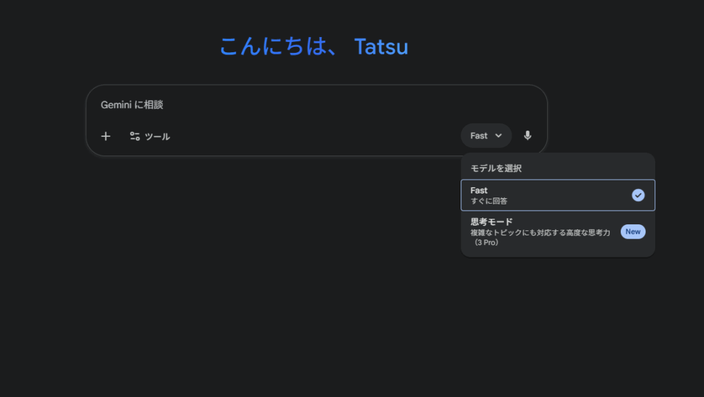 昨日までは「Gemini 3.0のリリースは年末予定」と考えていましたが、筆者アカウントでGeminiにアクセスしたところ、思考モード(3 Pro)の表示がしっかり現れていて驚きました。