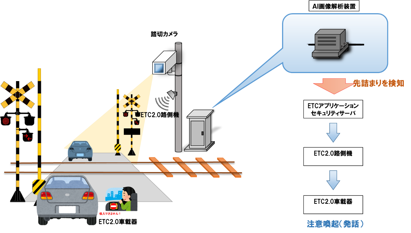 踏切に進入する車両のETC2.0車載器から「踏切の先詰まりに注意してください」と音声で警告し、踏切内での自動車の停滞を抑止して接触事故を防ぐことを目指す。