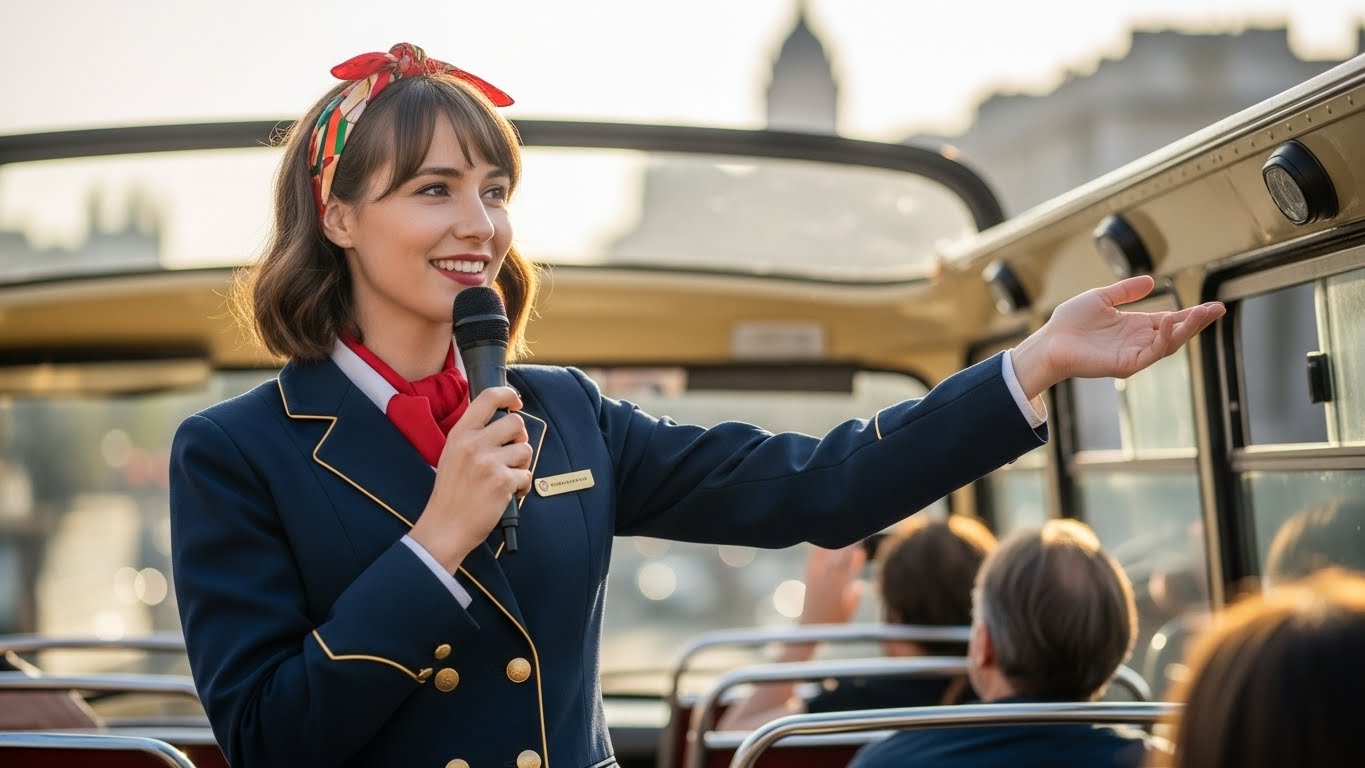 東京遊覧乗合自動車は当初、通常2人の案内人を乗車させました。最初は「大学卒の知識豊富な男性」が採用されました。しかしやがて、「流暢でやさしい口調の若い女性」が多く採用されるようになりました。声のトーン、語り方、存在そのものが、体験の一部として設計されていったのです。