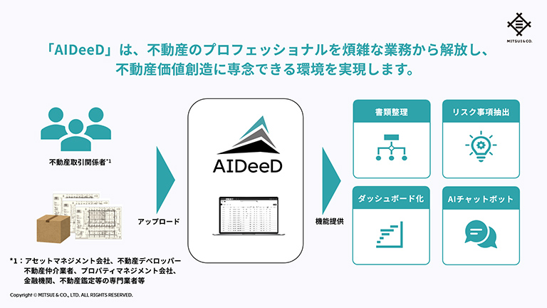 AIDeeDは、物件取得時の書類整理から保有期間中のプロジェクトマネジメント、売却時のパッケージ資料作成までの一元管理・運用を実現する。設計図書、行政確認書類、各設備の定期点検報告書などの専門文書を自動で命名・分類・整理し、書類の抜け漏れの確認やリスク事項の抽出が可能となる。三井物産グループ会社における先行利用では、約200ファイルある売却予定物件の場合、従来400分程度かけていた手作業によるファイル命名及びフォルダ整理業務の90%超を削減できた。