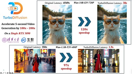 ShengShu TechnologyとTsinghua大学のTSAIL Labは2025年12月23日、AI動画生成を100倍から200倍高速化する新しい高速化フレームワークTurboDiffusionをオープンソース化したと発表した。このフレームワークは視覚品質をほとんど損なうことなく、リアルタイム動画生成を可能にする。