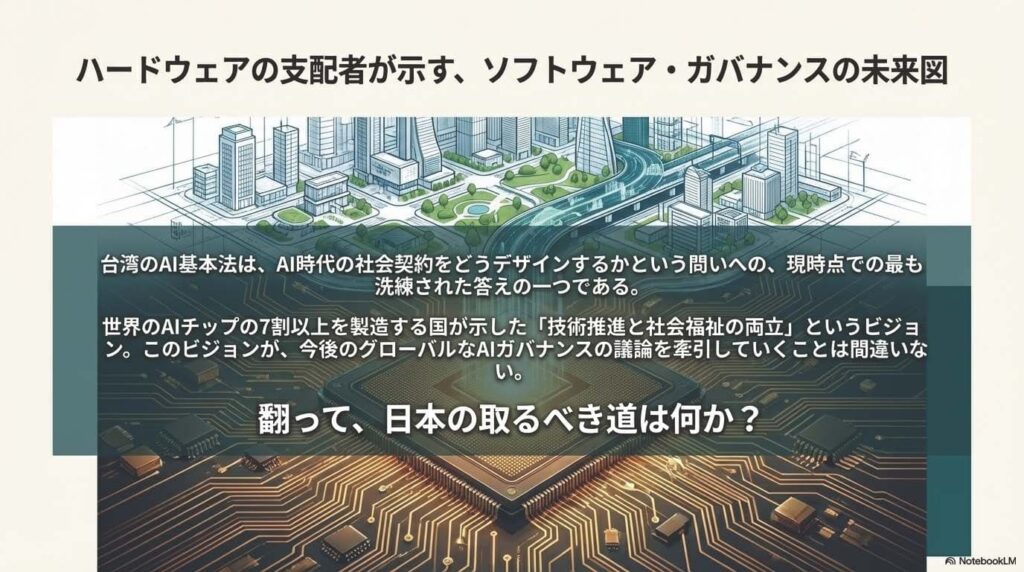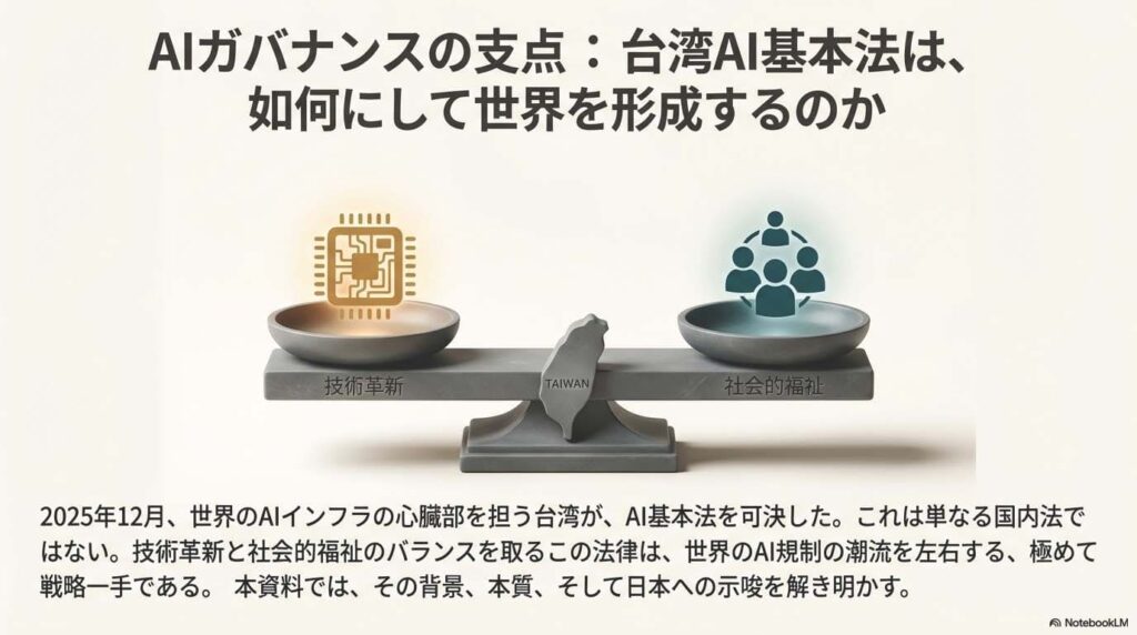 台湾がこのタイミングでAI基本法を制定したことは、私たちにも重要な問いを投げかけています。技術革新のスピードを落とさずに、いかにして社会的な安全と倫理を確保するのか。