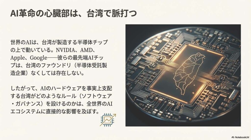 - 世界のAIチップ製造の中心地、台湾が基本ルールを定めた重要性。