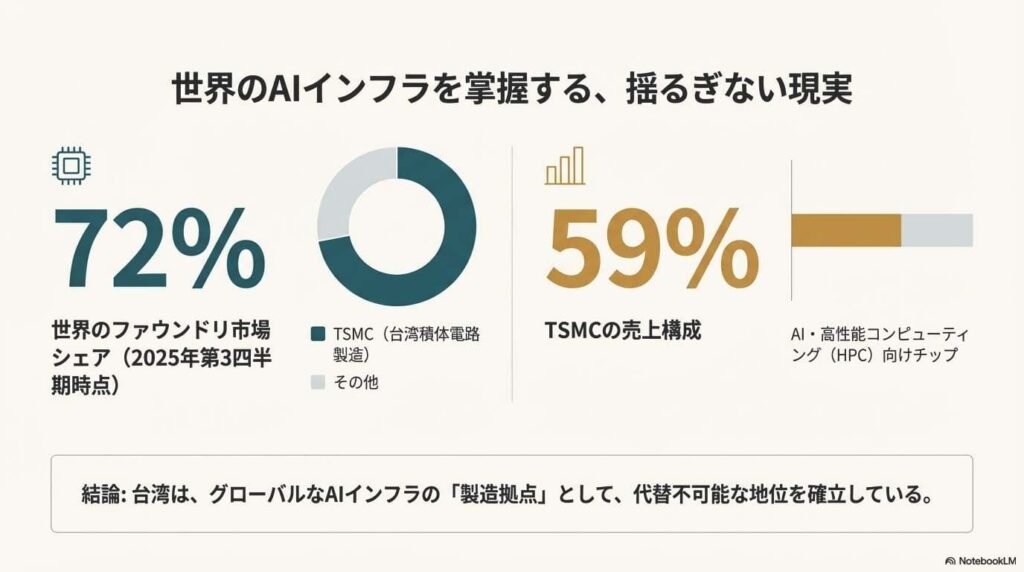 世界のAI技術は、その頭脳となる高性能な半導体チップなしには成り立ちません。そして、その心臓部を製造しているのが台湾です。台湾の半導体製造大手TSMC(台湾積体電路製造)は、世界のファウンドリ(半導体受託製造)市場で約72%という圧倒的なシェアを誇り、その売上の実に59%がAI・高性能コンピューティング向けチップによるものです。