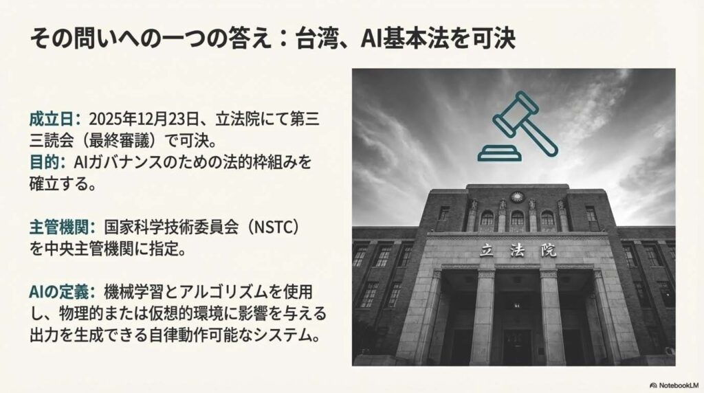 台湾がAI基本法を制定したのは、同国の産業構造における極めて重要な戦略的判断です。グローバルなAIインフラの「製造拠点」として事実上不可欠な存在である以上、その技術の利用に関する明確な指針を示すことは、国際社会に対する責任であり、自国の産業を守る上でも必然でした。この法律は、国家科学技術委員会を中央主管機関と定め、AIガバナンスの全体的な枠組みを確立するものです。