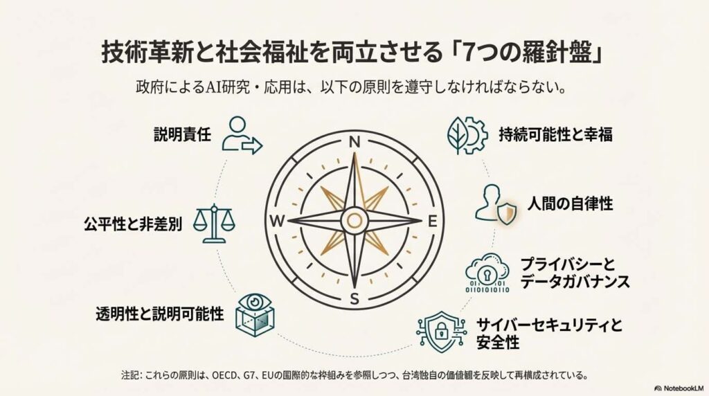 台湾のAI基本法は、政府がAIの研究・開発・応用を進める上で遵守すべき「7つの基本原則」を定めています。これらは、AIを社会にとって有益で安全なものにするための、いわば憲法のような役割を果たします。