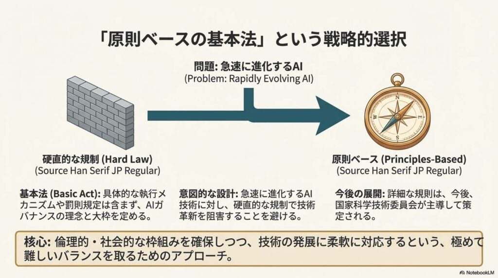 この法律の最大の特徴は、現時点では具体的な罰則規定などを含まない「原則ベースの基本法」であるという点です。これは、急速に進化を続けるAI技術に対し、硬直的なルールでその革新を妨げてしまわないようにするための「意図的な設計」と言えます。
