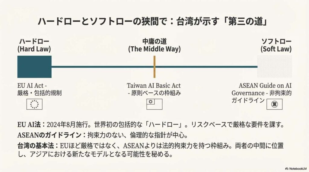 幸福、人間の自律性、プライバシーなどを重視し、単なる技術推進ではなく社会福祉との調和を目指すという明確な国家の意思を示しています。 - EUの厳格な法律とASEANの柔軟な指針の中間を行く「バランス型」のアプローチ。