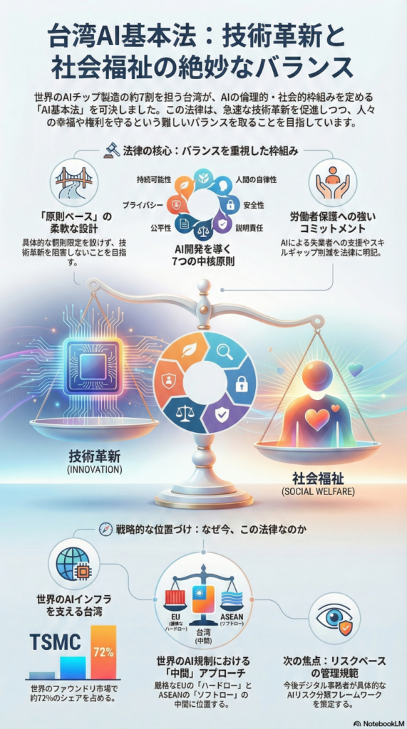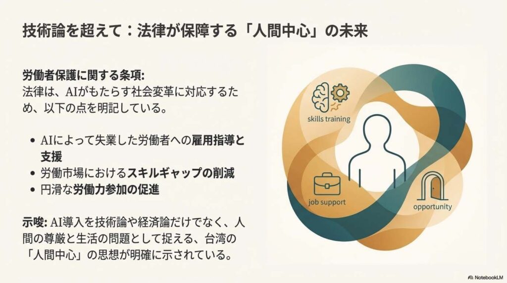 法律がこれほど労働者保護に紙幅を割いている点は特筆に値します。これは、台湾がAIの導入を単なる技術論や経済論ではなく、人間の尊厳と生活に関わる社会的な課題として捉えていることの力強い証拠です。