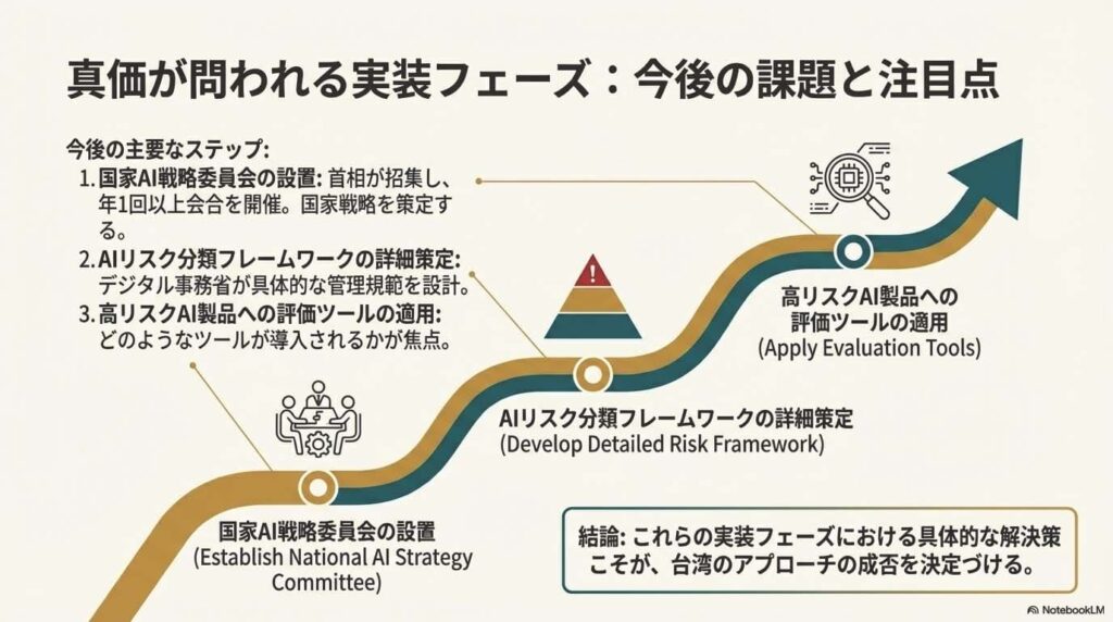 台湾は、世界の二大潮流のどちらにも偏らず、独自のバランス感覚でAIガバナンスを構築しようとしています。この法律はまだ骨組みの段階です。今後、どのような課題が待っているのでしょうか。最後に、今後の展望と私たちへの影響を考えてみましょう。