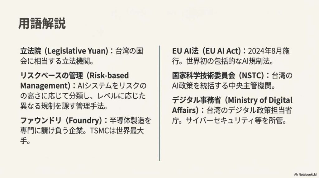 世界のAIインフラを支える国が示したこの「第三の道」は、日本のAI戦略にとっても重要な示唆を含んでいます。EUの厳格さと米国の自由放任主義の間で、私たちはどのような立ち位置を選ぶべきなのか。台湾の取り組みを注視しながら、日本独自の答えを見つけていく必要があるでしょう。