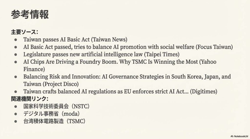 重要なのは、台湾が単に中間を選んだわけではない点です。ソースコードによると、7つの原則はOECDやEUのAI法といった国際的な枠組みを参照しつつも、台湾独自の産業構造と社会的価値観を反映して「再構成」されています。これは、グローバルスタンダードに準拠しながらも、自国の状況に最適化した独自のAIガバナンスを築こうとする、台湾のしたたかな国家戦略の表れと言えます。