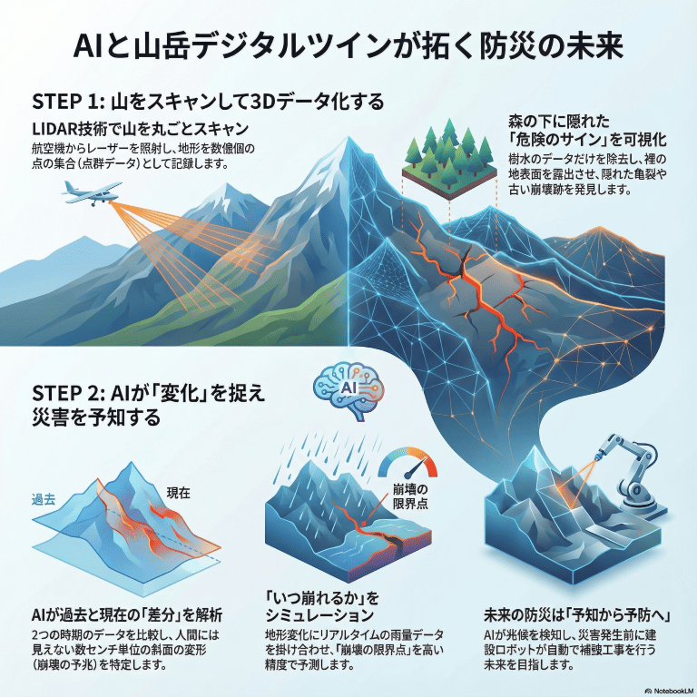 そこで今、世界の防災テックが挑んでいるのが、山そのものをサイバー空間にコピーする「山岳デジタルツイン」の構築です。物理空間の自然をデータとしてハックし、災害を予知する。そんなSFのような取り組みが、現実のものとなりつつあります。