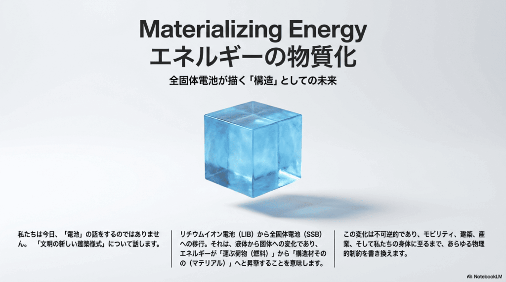 物質化するエネルギー:全固体電池(SSB)がもたらす「アンテザード・ソサエティ」の衝撃