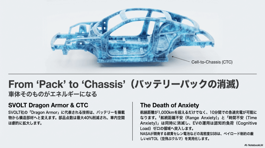 モビリティ分野では、SSBは車両設計における制約条件から、設計自由度を高める要素へと変わりつつある。不燃性や熱安定性といった特性は、バッテリーを車体構造とより密接に統合する設計思想──いわゆるCell-to-Chassis(CTC)や構造一体化アプローチ──との相性が良いと考えられている。