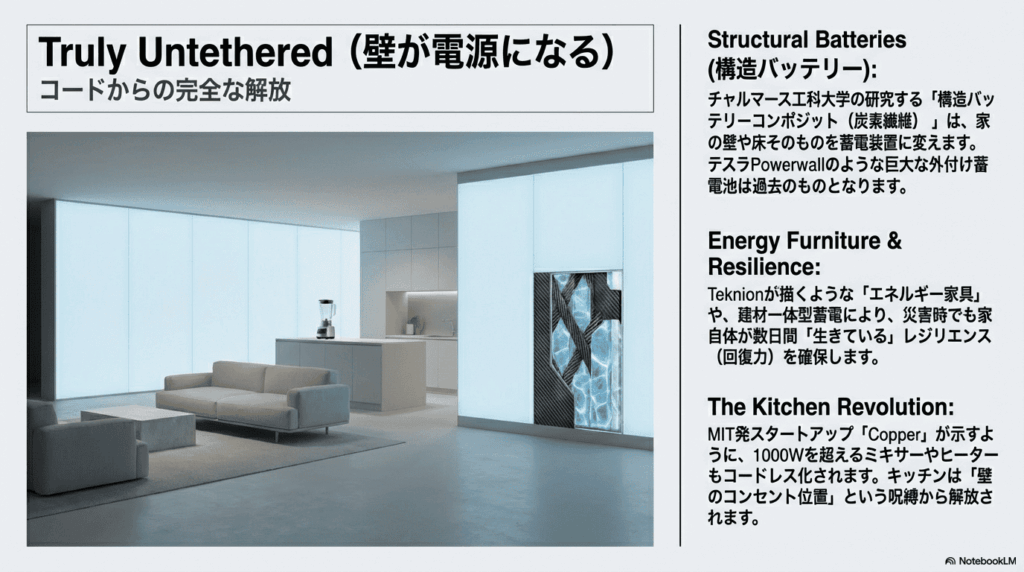 家具にエネルギー貯蔵機能を持たせるという構想も提案されているが、具体的な容量や実用性については製品ごとに差があり、現時点ではコンセプト段階の側面が強い。