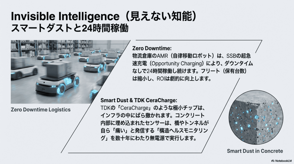 産業用途では、バッテリー性能は稼働率と直結する。自律移動ロボット(AMR)などにおいて、急速充電や高耐久電池はダウンタイムを短縮し、フリート全体の効率向上に寄与し得る。SSBはその候補技術の一つとして研究・検討が進められている。