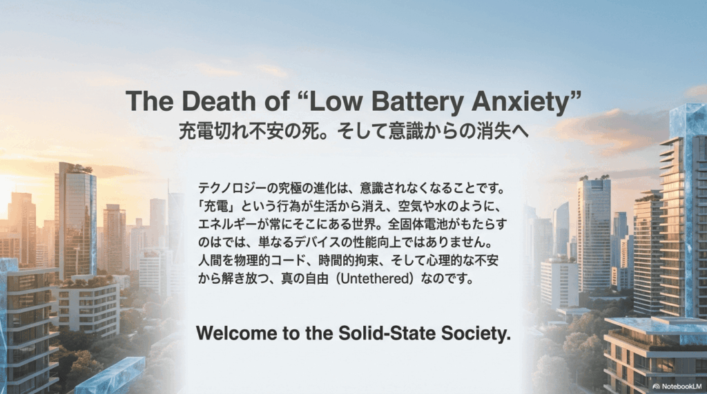 技術の成熟とは、それが特別な存在でなくなり、背景に溶け込むことでもある。SSBは、安全性・設計自由度・耐久性といった観点から、エネルギーをより「意識しなくてよいもの」に近づける可能性を持つ。