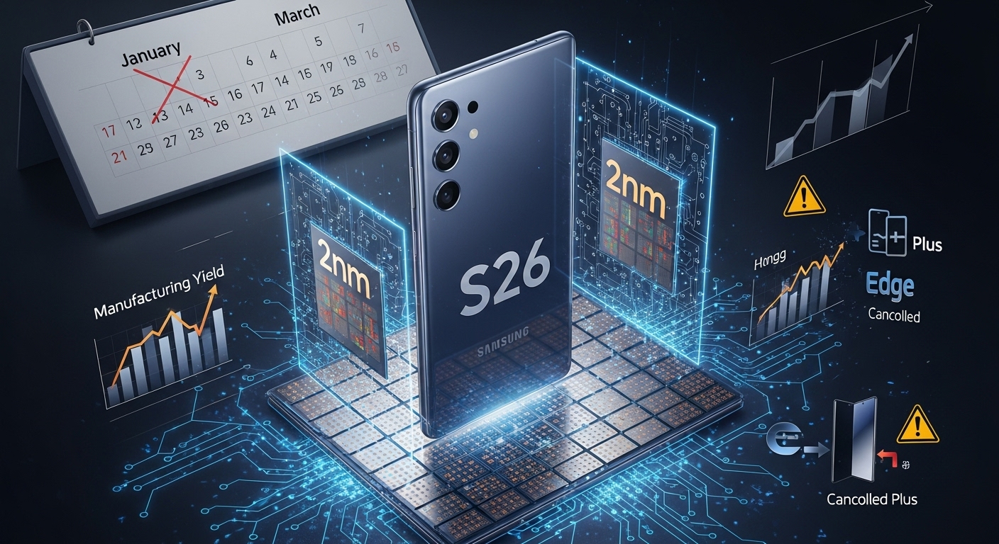 通常1月に発売されるGalaxy Sシリーズだが、開発後期段階での製品ラインナップ変更が原因とされる。当初はGalaxy S26 Pro、S26 Edge、S26 Ultraの3機種を計画していたが、Galaxy S25 Edgeの販売状況を受けてS26 Edgeをキャンセルし、S26+に変更した。