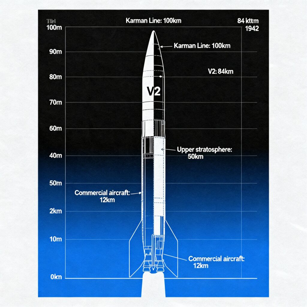 この高度がどれほど凄いか――当時の航空機は高度10~13km程度が限界でした。V2はその約6~8倍も高い場所に到達したのです。比較すると、民間旅客機が飛ぶ高度約12km、成層圏の上限が約50km。そして国際的に宇宙の定義とされる「カーマン・ライン」は高度100km。V2の84kmは、米国空軍が宇宙の境界と定める80kmを超えており、この基準では完全な宇宙空間です。