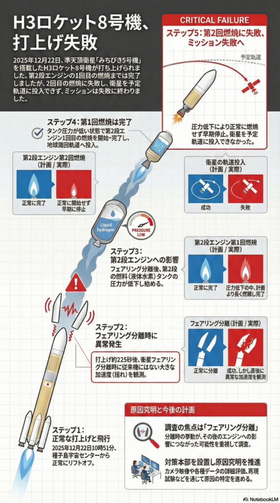 国立研究開発法人宇宙航空研究開発機構は2025年12月25日、宇宙開発利用部会 調査・安全小委員会第58回において、H3ロケット8号機の打上げ失敗原因究明状況を報告した。2025年12月22日10時51分30秒に種子島宇宙センターから打ち上げたH3ロケット8号機は、準天頂衛星システム「みちびき5号機」の軌道投入に失敗した。