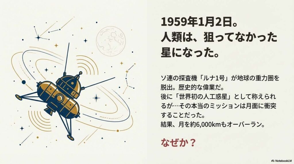 この日、人類は歴史上初めて「第2宇宙速度(約11.2km/s)」を突破し、地球の重力圏を脱出するという偉業を成し遂げました。ルナ1号は後に「世界初の人工惑星」として称えられますが、実はその裏に、現代のDXやAI開発に通じる「致命的な設計思想のミス」が隠されていたことをご存知でしょうか。