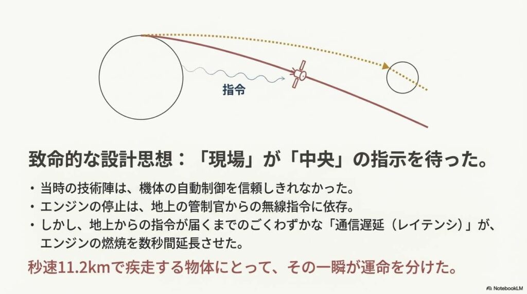 当時の技術陣は、機体上の自動制御システムを完全には信頼せず、地上の管制官からの無線指令によってエンジンをカットオフする方式を採用していました。しかし、地上からの指令が機体に届き、実行されるまでのごくわずかな「通信遅延(レイテンシ)」と処理ラグにより、エンジンは予定よりもわずかに長く燃焼してしまったのです。