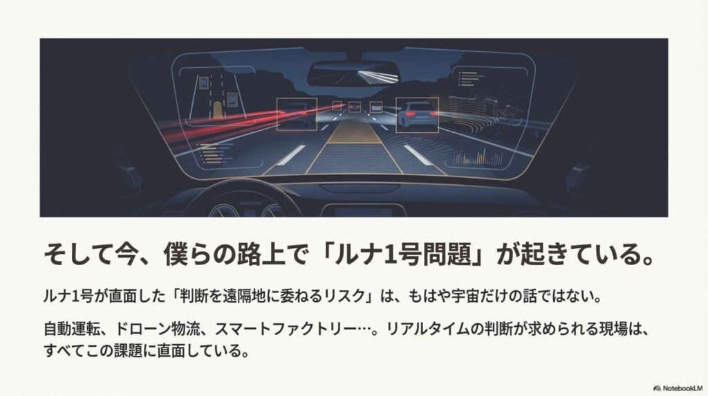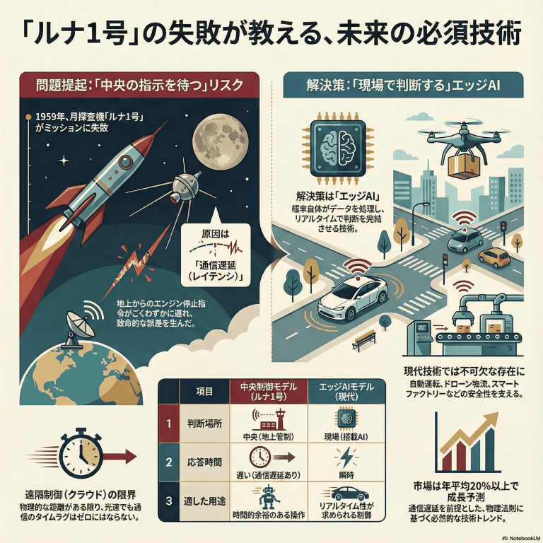 これらの産業において、「通信は必ず遅れるものであり、時には途切れる」という前提に立つことは、リスク管理の鉄則です。ルナ1号の失敗は、通信インフラがいかに高速化(5G/6G)しようとも、物理的な距離と処理時間が存在する限り、「判断の現地化(エッジコンピューティング)」が不可欠であることを教えてくれます。