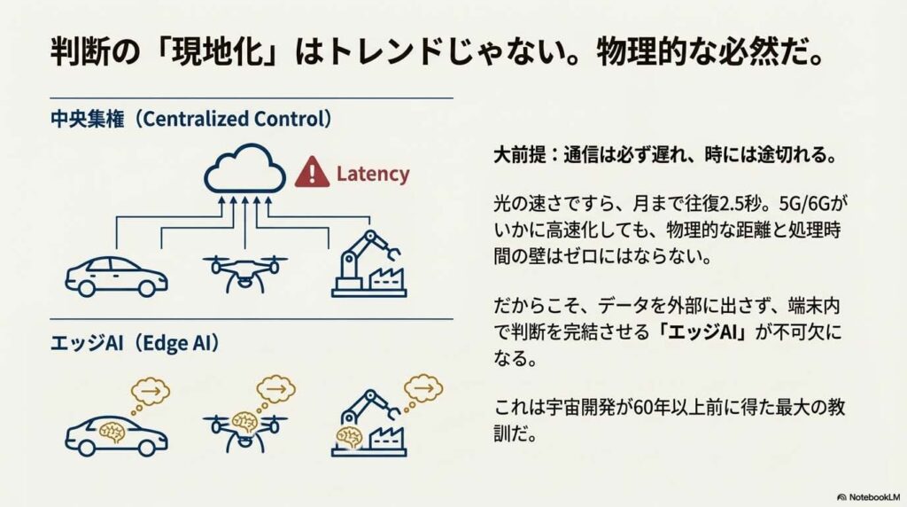 これはまさに、データを外部に出さず、端末内で処理・推論・判断を完結させる**「エッジAI(Edge AI)」**そのものです。宇宙開発の歴史は、中央集権的な「ラジコン制御」から、現場完結型の「自律制御」への移行の歴史でもあるのです。