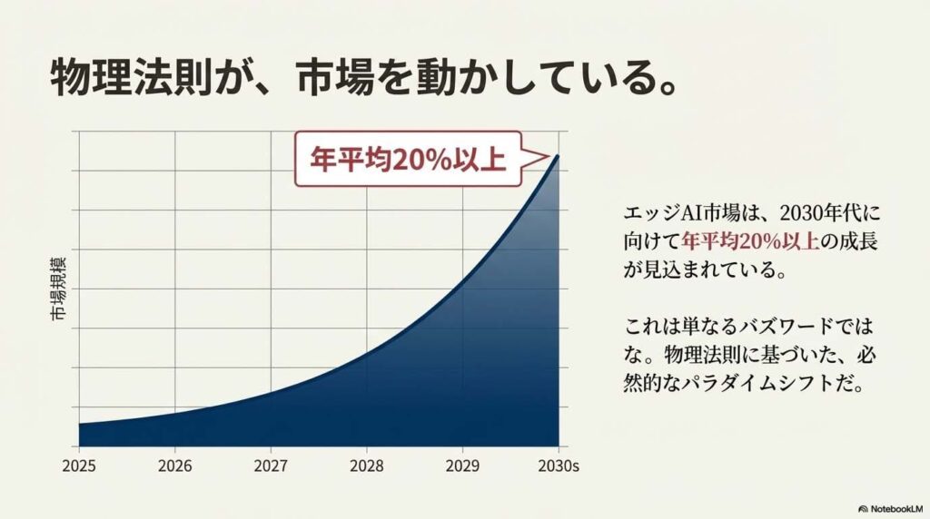 市場調査によると、エッジAI市場は2030年代に向けて年平均20%以上の成長が見込まれています。これは単なる技術トレンドではなく、物理法則に基づいた必然的な帰結なのです。