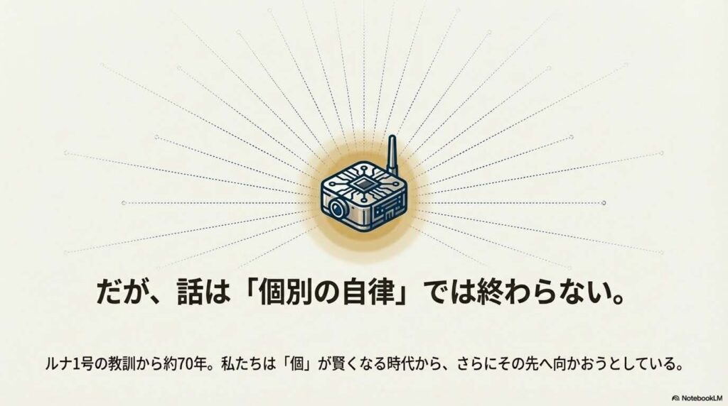 ルナ1号の教訓から約70年。私たちは今、「個別の自律」からさらに一歩進んだ未来へ向かおうとしています。