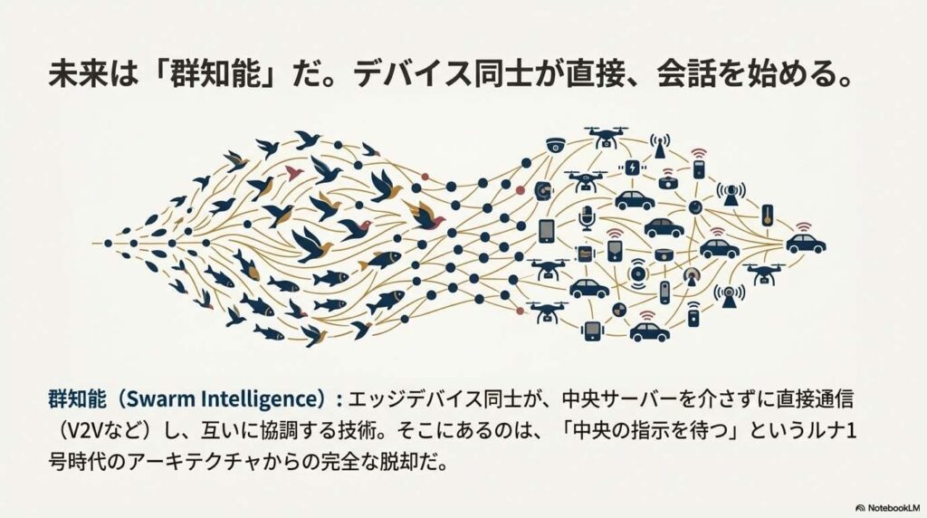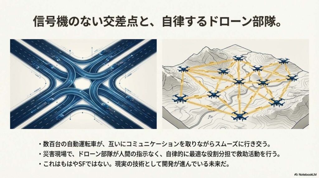 それが「群知能(Swarm Intelligence)」です。 エッジデバイス同士が、中央サーバーを介さずに直接通信(V2Vなど)し、互いに協調する技術です。信号機のない交差点を数百台の自動運転車がスムーズに行き交う未来や、災害現場でドローン隊が自律的に役割分担をするシステムの構築が進んでいます。