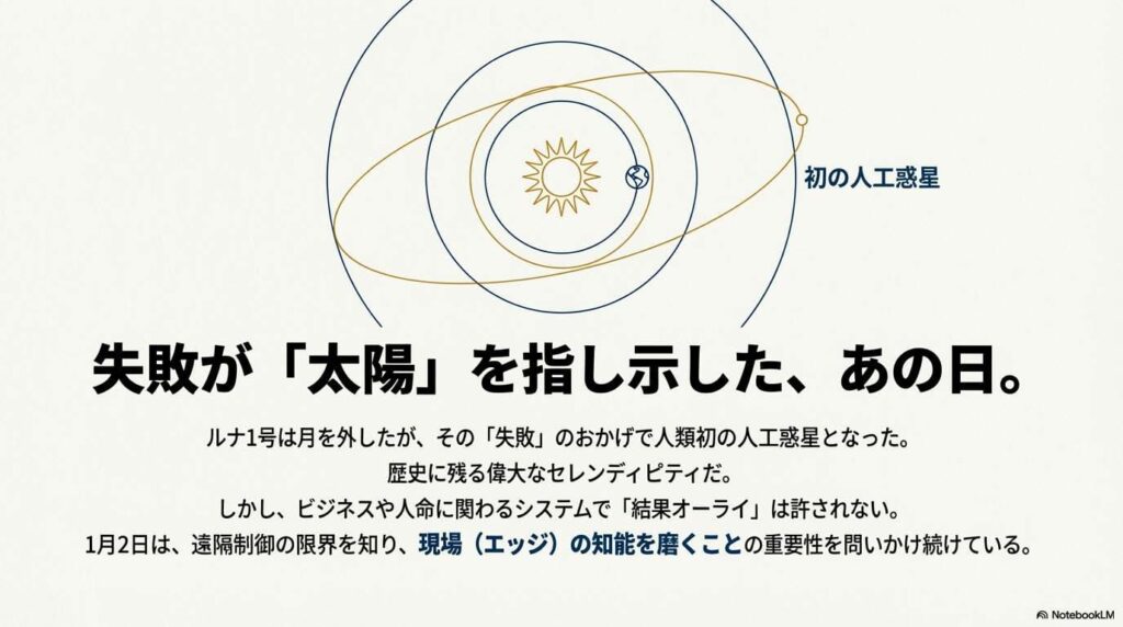 しかし、ビジネスや人命に関わるシステムにおいて、「結果オーライ」は許されません。 1月2日という日付は、ルナ1号の偉業を称えるとともに、「遠隔制御の限界を知り、現場(エッジ)の知能を磨くこと」の重要性を、現代の私たちに問いかけています。