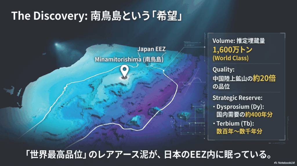 日本の排他的経済水域(EEZ)内に広がるそのポテンシャルは、我々の想像を絶する。日本の国内需要に対し、中国への依存度が極めて高いジスプロシウムが約400~560年分、強力な磁石に不可欠なテルビウムは約320年分という、国家の運命を左右するに足る量が埋蔵されていると推定されている。これは、単なる代替調達先ではなく、資源地図そのものを塗り替えるほどの圧倒的な量だ。