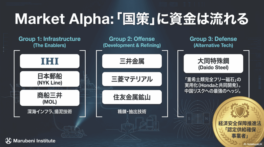 同社は、経済安全保障推進法に基づき、永久磁石の供給確保計画で政府から認定を受けている。EVモーターなどに不可欠なネオジム磁石において、供給が不安定な重希土類への依存を低減する技術開発を進めており、サプライチェーンの脆弱性という市場の最大の懸念に応える企業として、投資家からの注目が集中している。 - サプライチェーン強靭化を担う「国策銘柄」:住友金属鉱山・三菱マテリアル 等