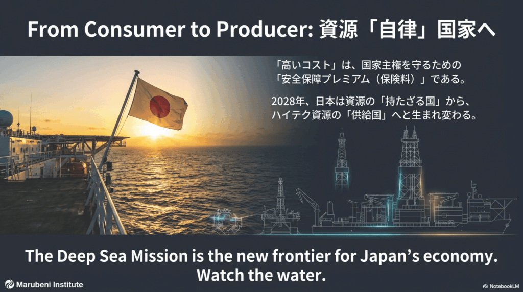 我々が提唱したいのは、「安全保障プレミアム(Security Premium)」という新しい価値基準である。南鳥島プロジェクトにかかるコストは、単なる経費ではない。それは、供給が途絶した場合に発生する数兆円規模の経済損失と、それに伴う社会全体の混乱を未然に防ぐための「国家的な保険料」として捉えるべきだ。このプレミアムを支払うことで、日本は経済的な主権と未来の選択肢を確保することができる。