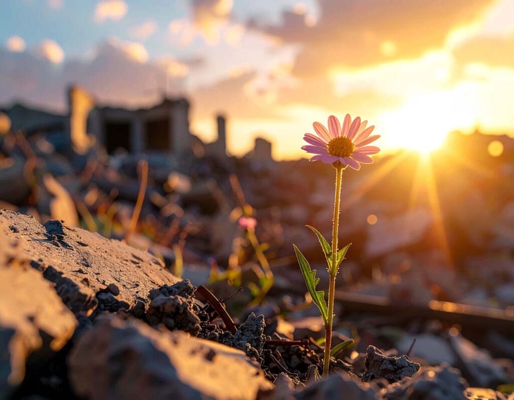 A single, resilient wildflower piercing through the rubble and debris of a war-torn battlefield, cinematic lighting, photorealistic, symbol of hope