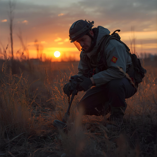 A brave mine sweeper specialist in protective gear carefully scanning the ground with a metal detector in a post-war landscape. Sunset lighting, hopeful atmosphere despite the serious work, cinematic composition, digital painting style with realistic details.