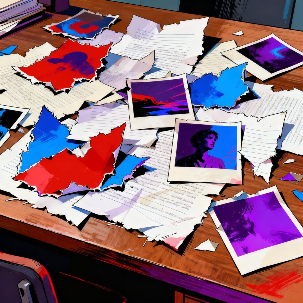 GPT Image 1:映画のワンシーン感。切なさとロマンチックさの絶妙バランス。ラブレターの破片が夕陽に照らされ、物語の残響が心に残る。