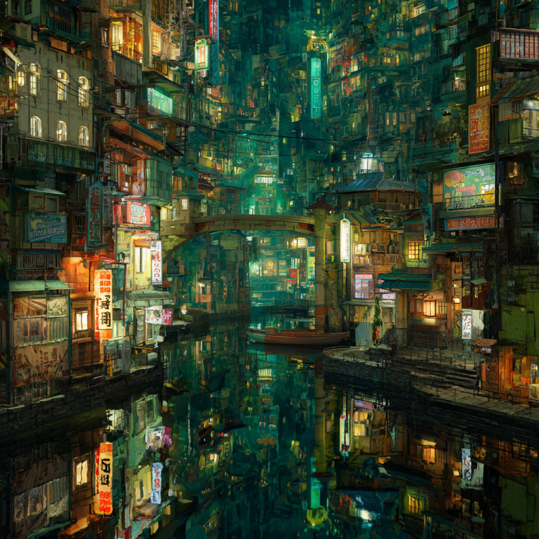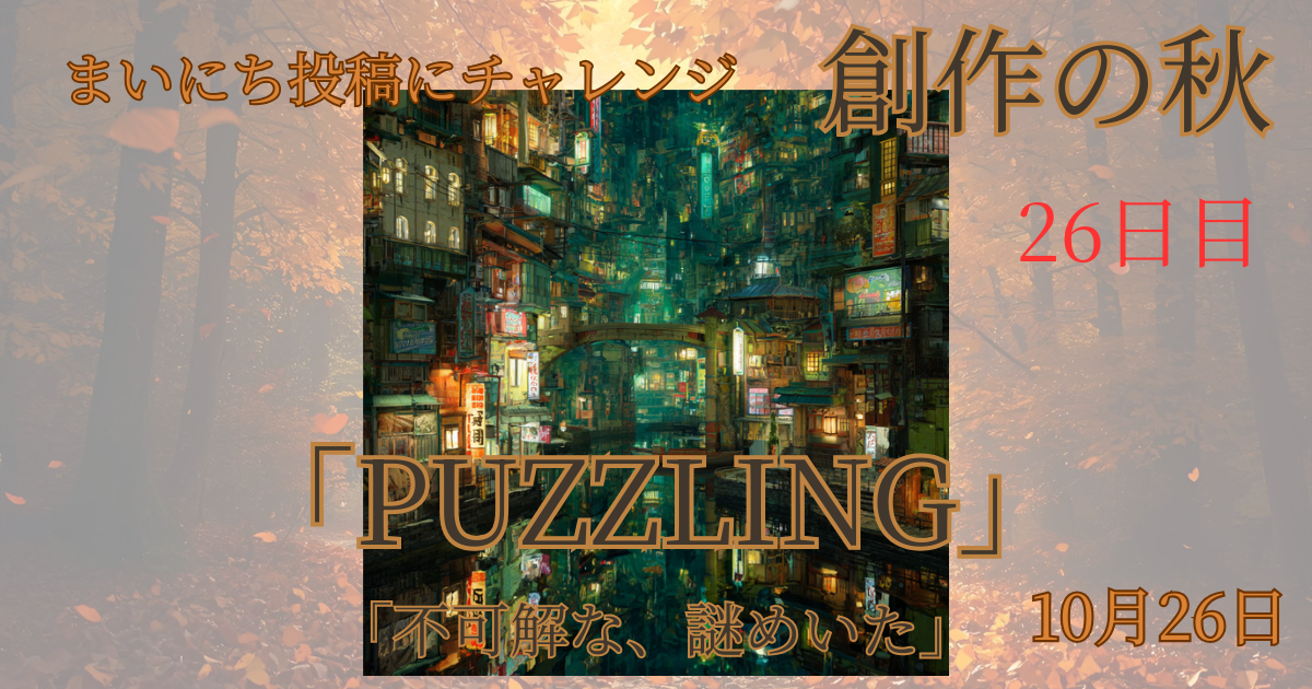 瓦屋根の上で、ネオンが瞬く――まさに“PUZZLING”な街。