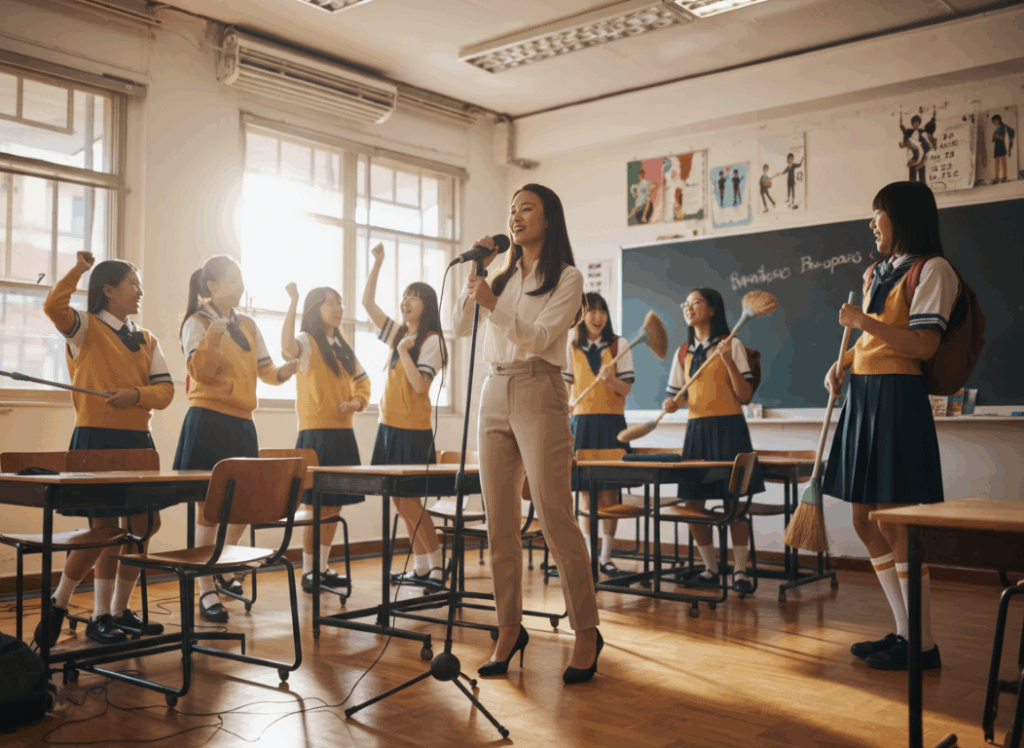 先生がマイクで熱唱し、生徒がほうきギターをかき鳴らし、みんながノリノリで歌ってる!