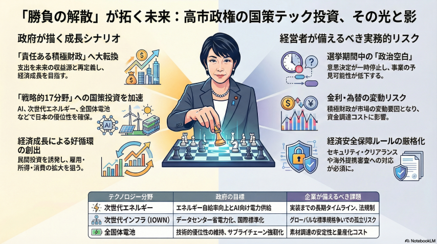 今回の解散は、単なる政治イベントではありません。政府が進める「責任ある積極財政」への信を問い、AIや次世代エネルギーといった、いわゆる「戦略的17分野」への国策投資を加速させるための重要なピボット(転換点)となる可能性があります。一方で、選挙期間中の政治的な空白や、積極財政に伴う金利・為替の変動といった実務的なリスクも無視できません。