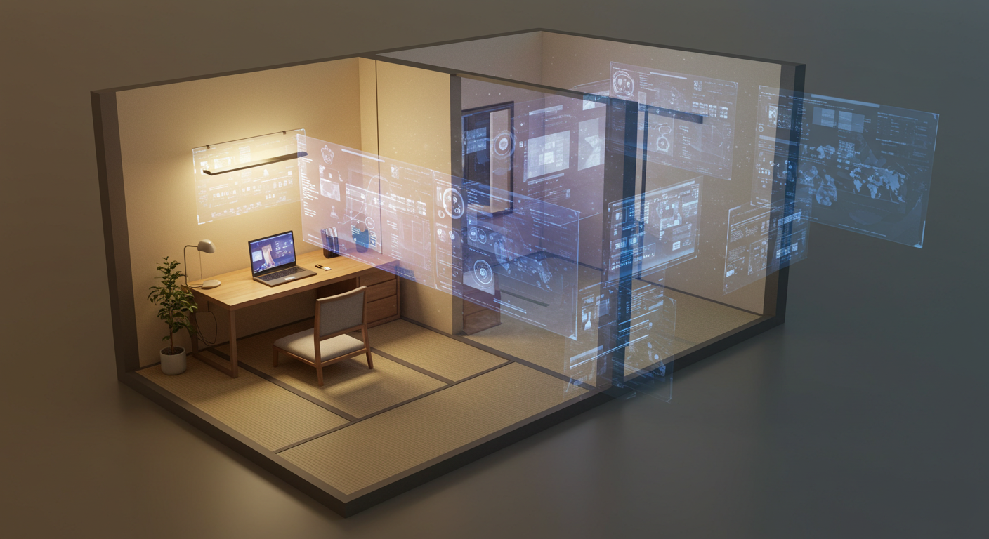 「広い部屋が必要」という先入観は、物理的なディスプレイの時代の思考です。空間コンピューティングの時代には、物理空間の広さは本質的な要件ではありません。問われているのは、空間をどう使うかという想像力です。